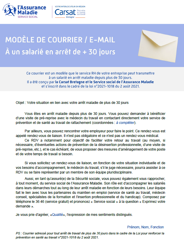 Un kit d’information a été conçu par la Carsat Bretagne pour communiquer l’essentiel à savoir par vos salariés en arrêt longue durée :